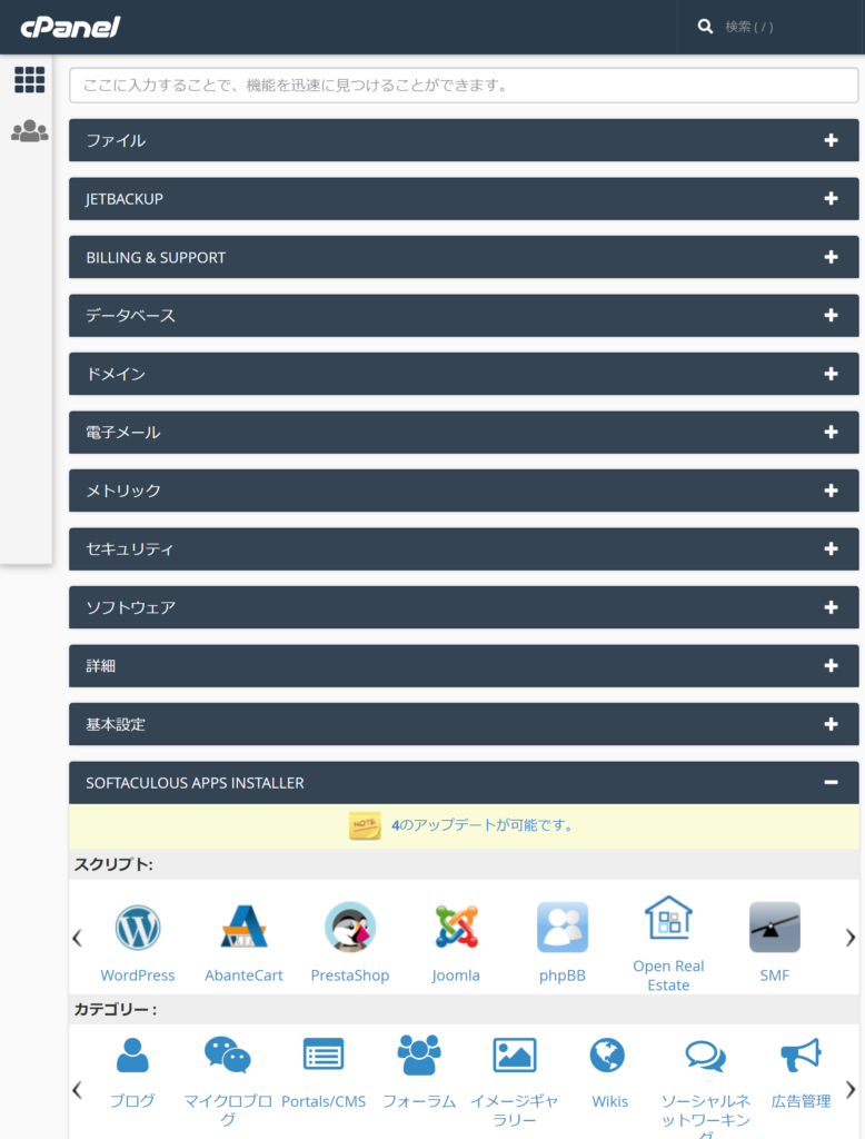 エックスサーバーはまだわかりやすいですが、Cパネルは海外でメジャーのため一部英語だったりします。